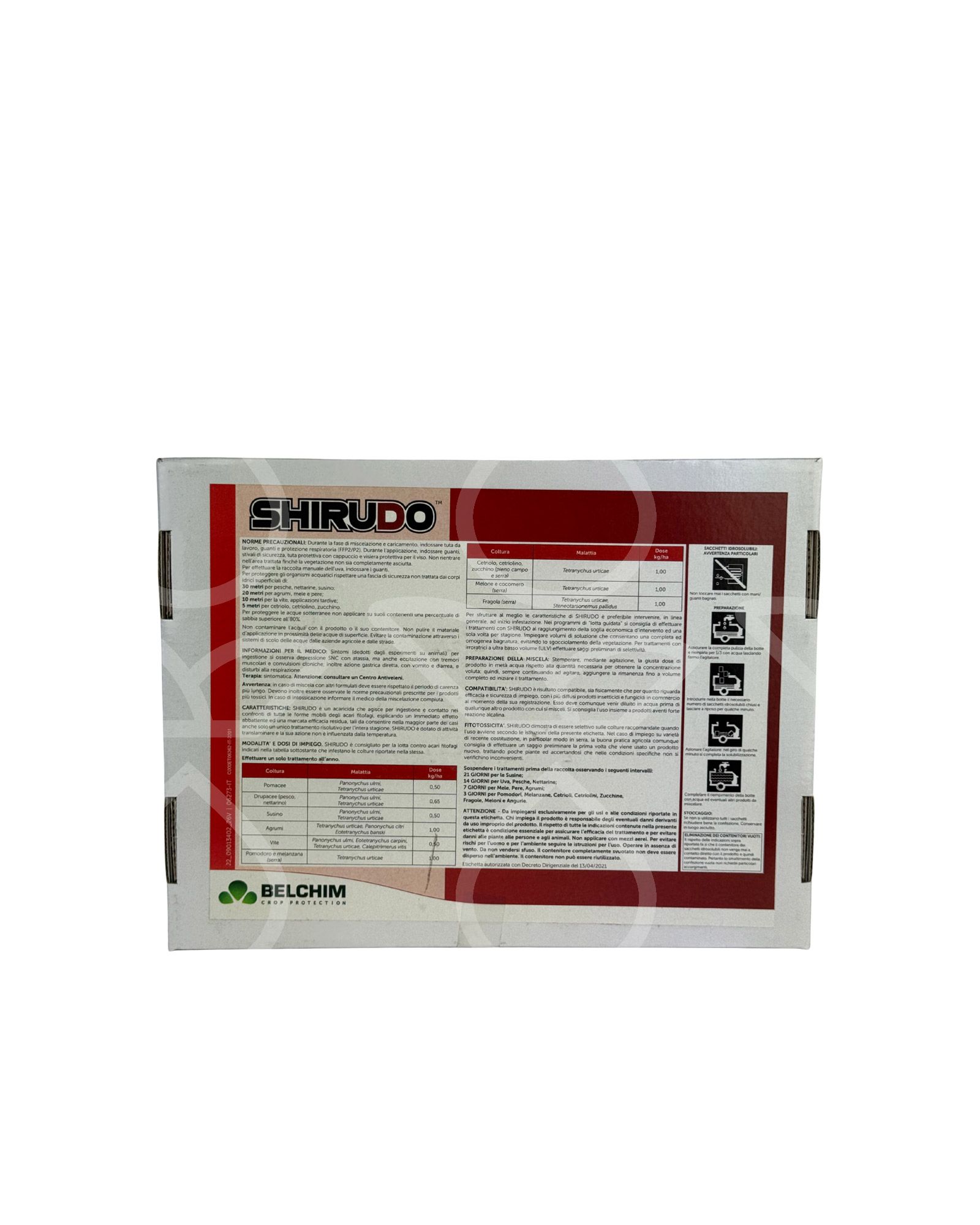 SHIRUDO è caratterizzato da elevata efficacia con rapido effetto abbattente ed elevata persistenza di azione, agisce per contatto ed ingestione bloccando la produzione di energia a livello cellulare.