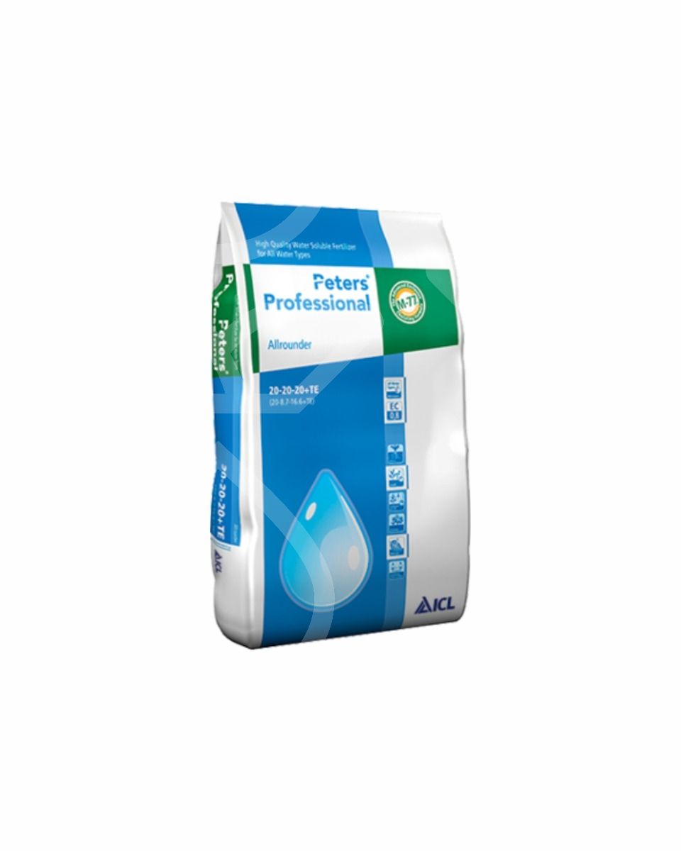Peters Professional Allrounder ha un titolo bilanciato, dove il rapporto N:P:K è 1:1:1. Oltre a azoto, fosforo e potassio, contiene urea. È pensato in particolare per applicazioni durante i mesi estivi. Agisce anche come nutrimento fogliare e favorisce la crescita della pianta. È la scelta perfetta per tantissimi tipi di piante in tutte le condizioni di coltivazione. È esente da sali zavorra grazie alla purezza delle sue materie prime.