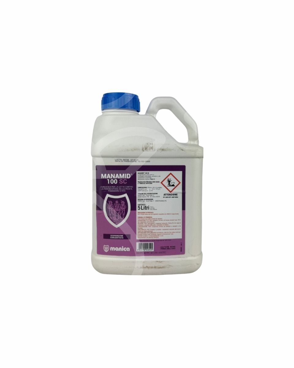 MANAMID® 100 SC è un fungicida ad azione preventiva per il controllo della peronospora di vite, pomodoro e patata; è dotato di elevata affinità per le cere cuticolari, con moderata capacità di penetrazione; ne derivano resistenza all’azione dilavante della pioggia e parziale ridistribuzione all’interno della vegetazione trattata.